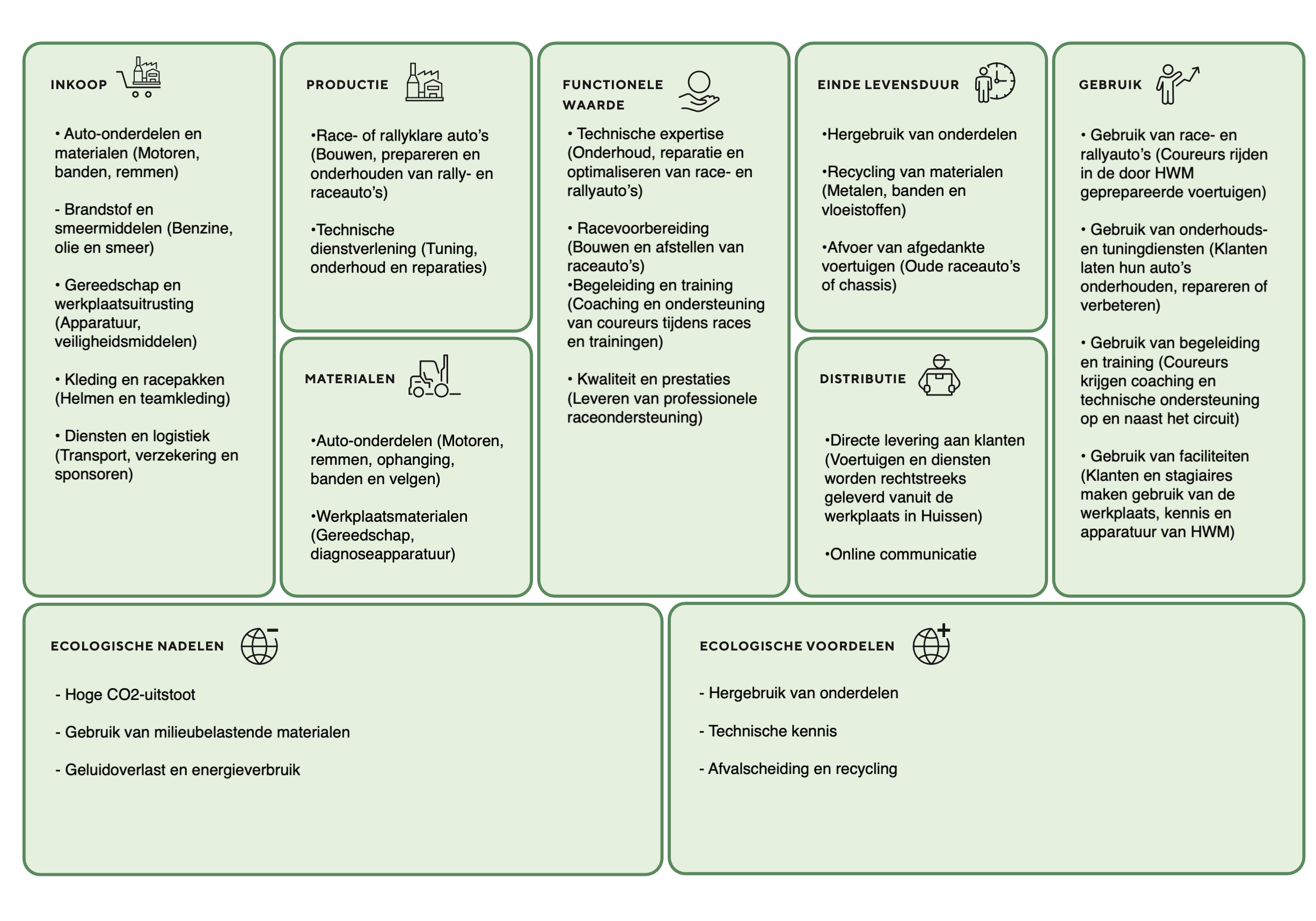 Daarnaast is er ook enige samenhang tussen de economische en ecologische laag: De sterke focus op auto’s, transport en evenementen bepaalt zowel de kostenstructuur als de milieubelasting. Efficiënt gebruik van materieel en planning heeft daardoor tegelijk financiële én ecologische gevolgen.